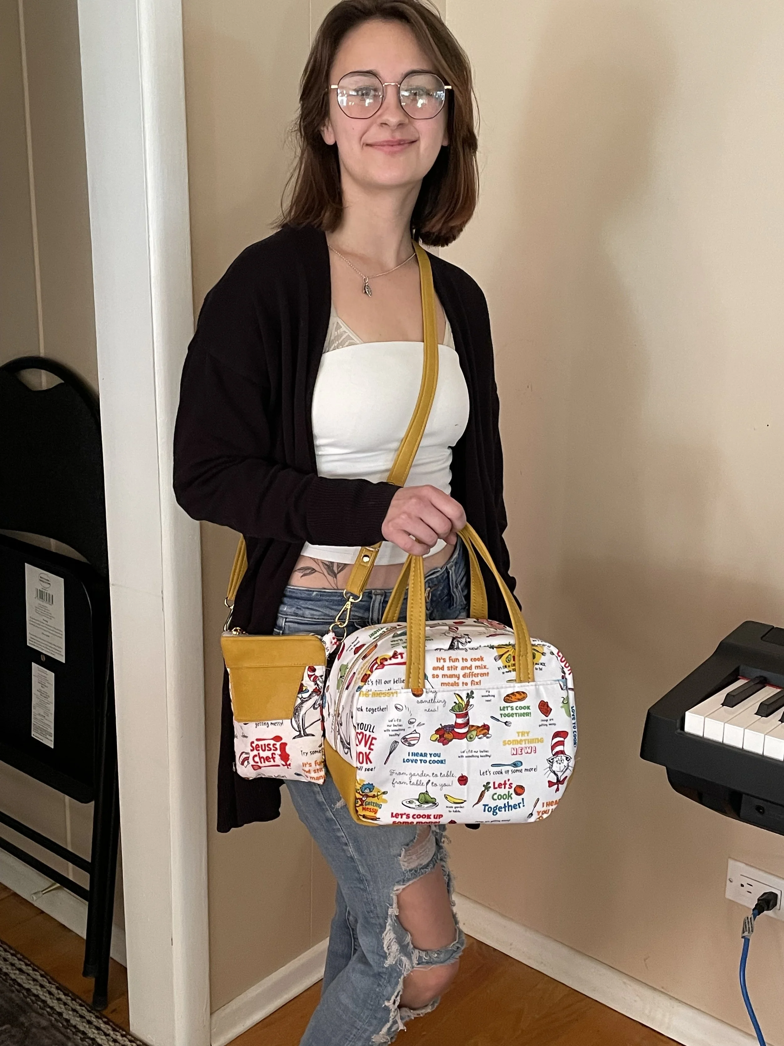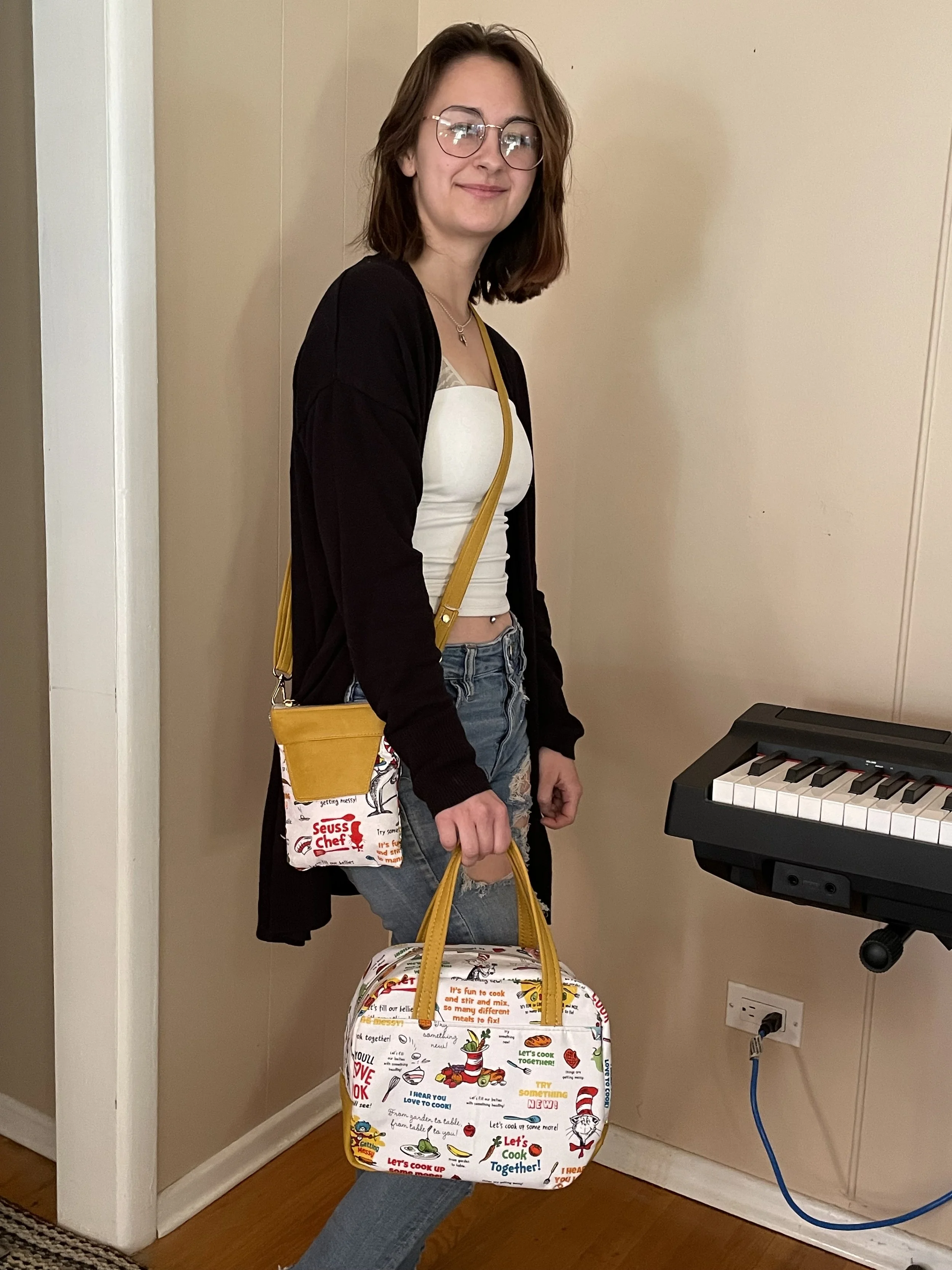 Here is my grand daughter Emily modelling her Dr Seuss Cell phone/lunch bag set. She’s a great cook and Dr Seuss is all about cooking on this fabric!