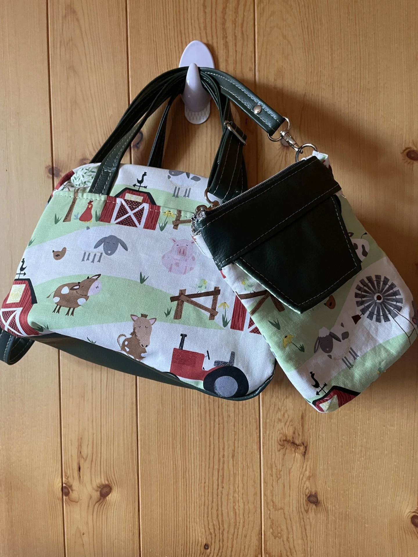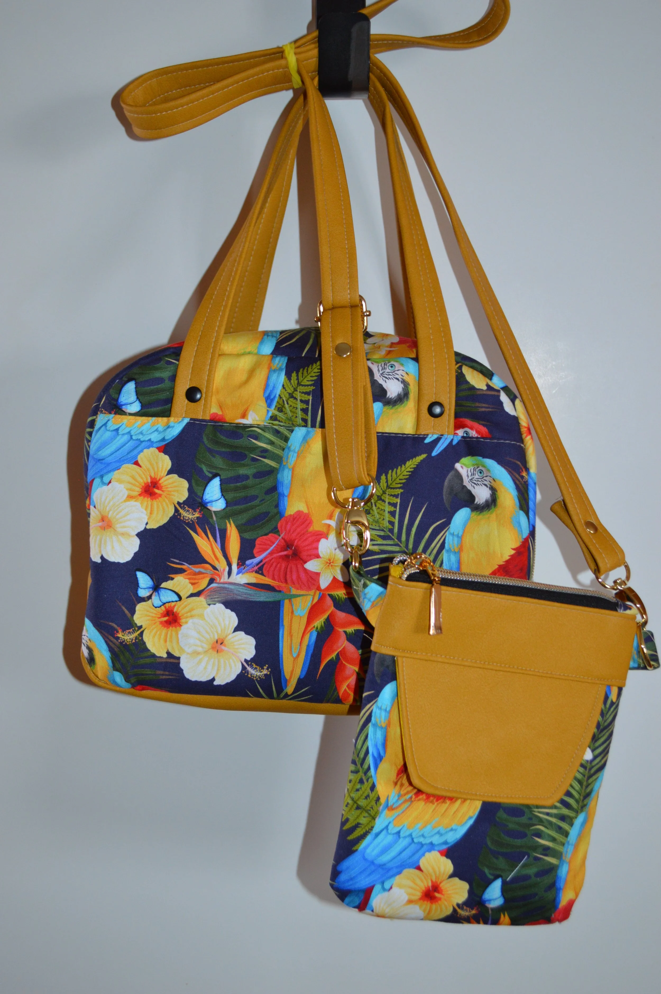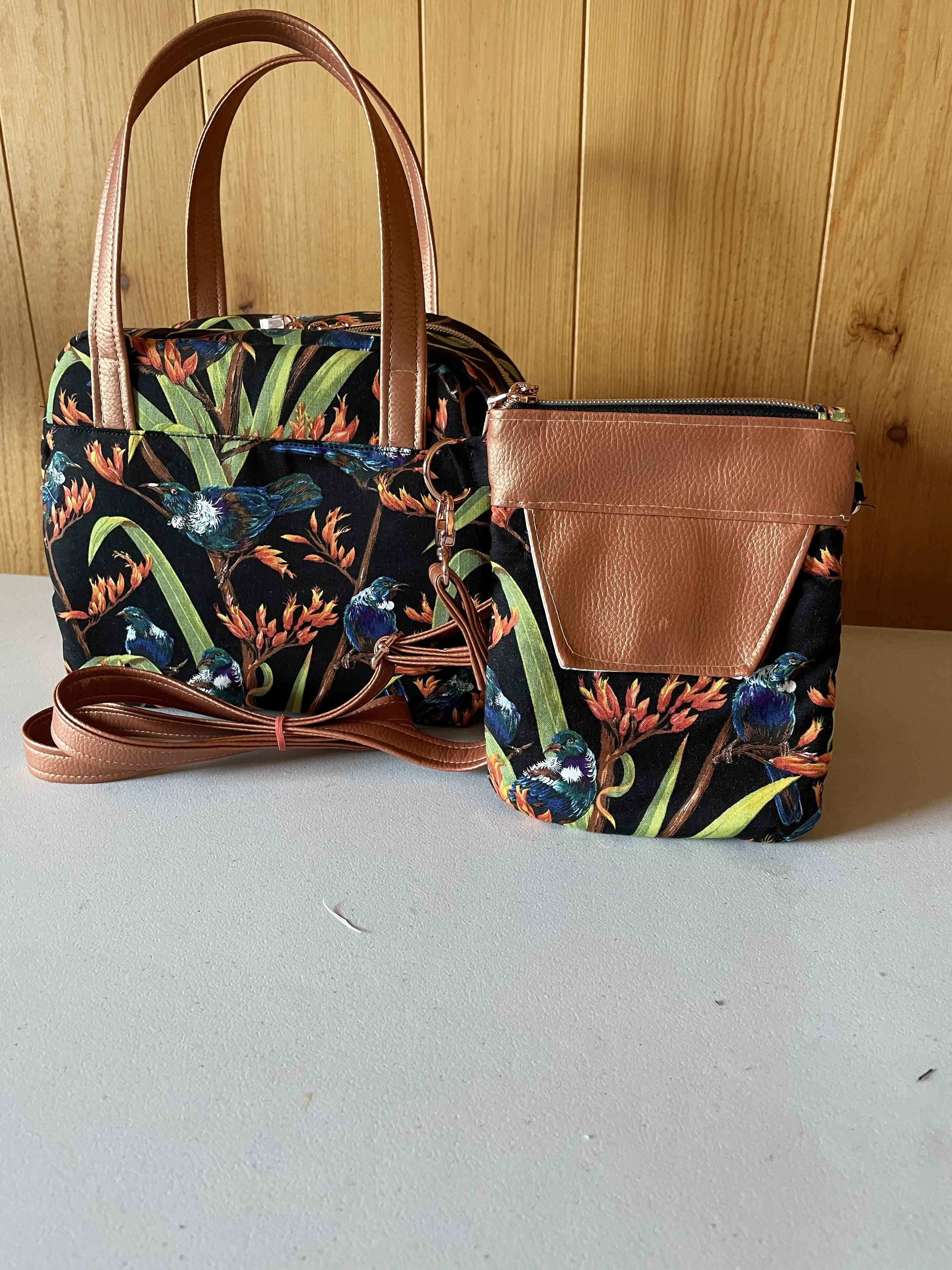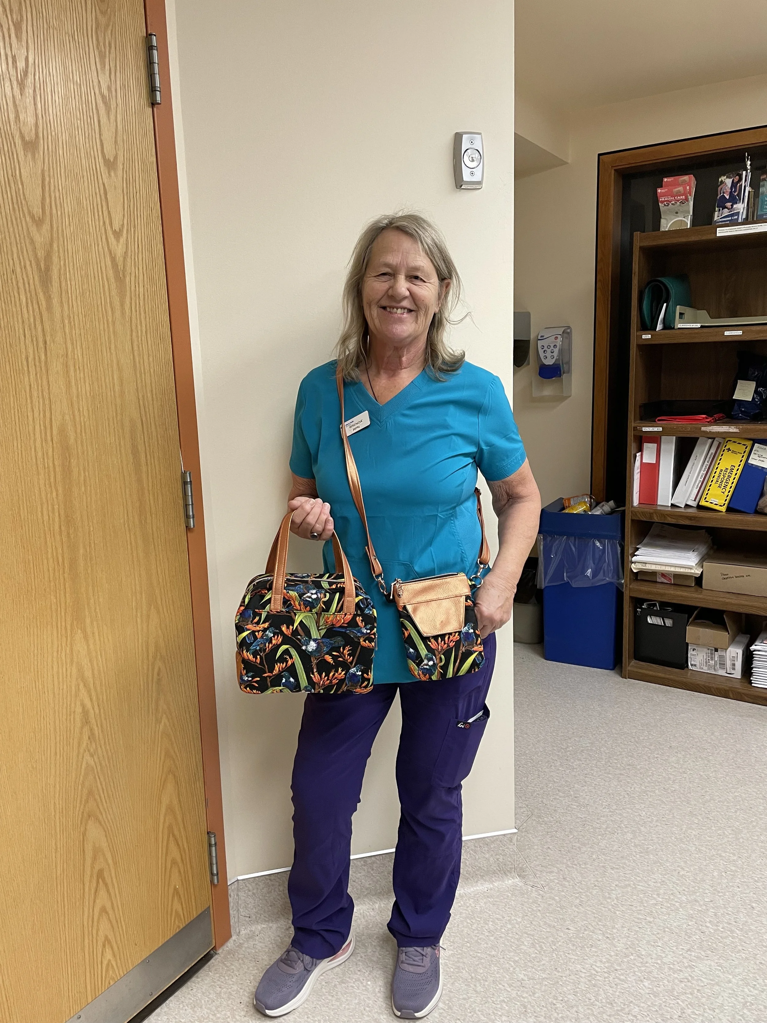 This is Brenda, my co worker! She has a bag set made from fabric of New Zealand, her home country! It has the NZ Tui Bird and Flax plant, custom made for my friend.