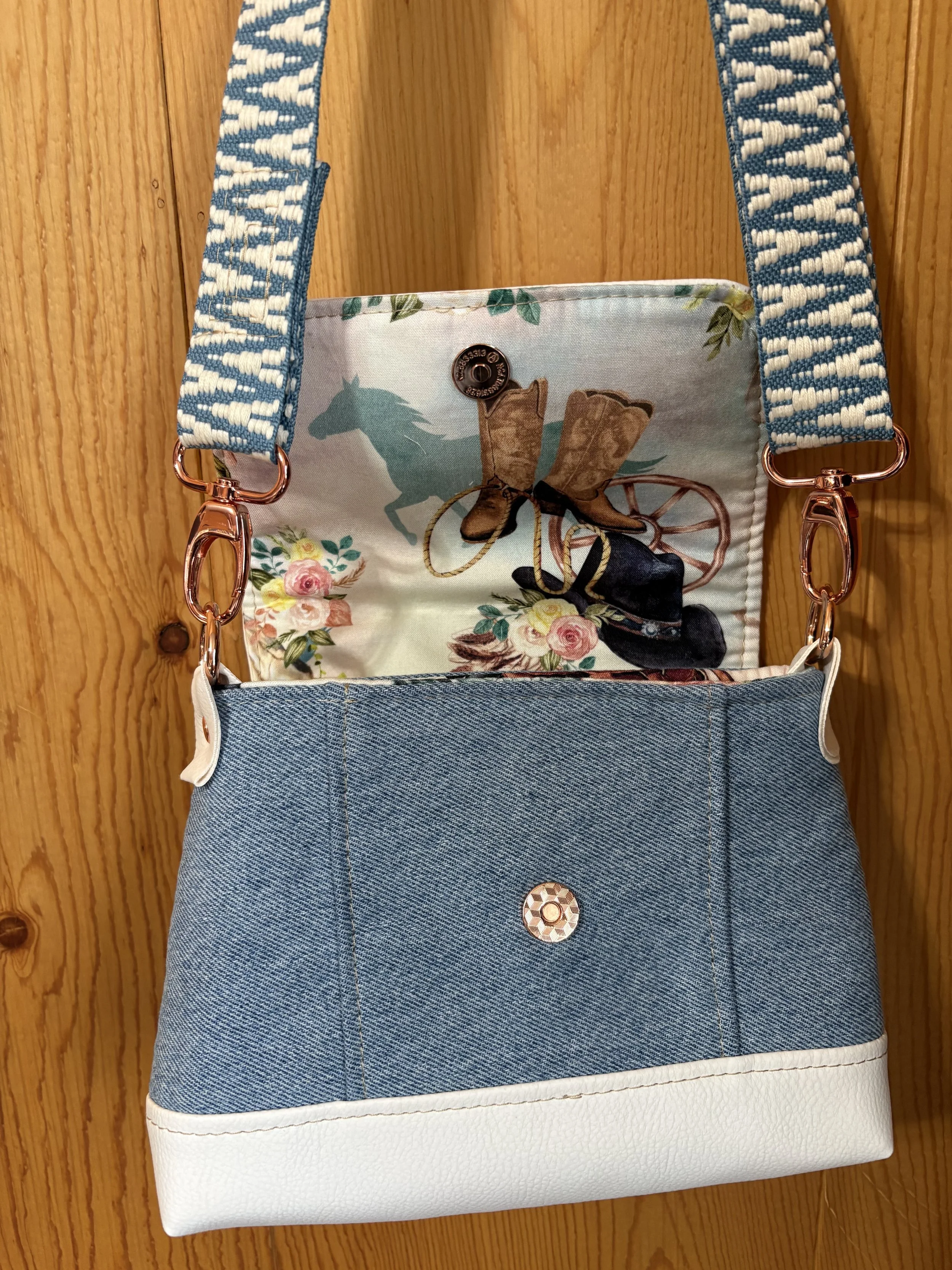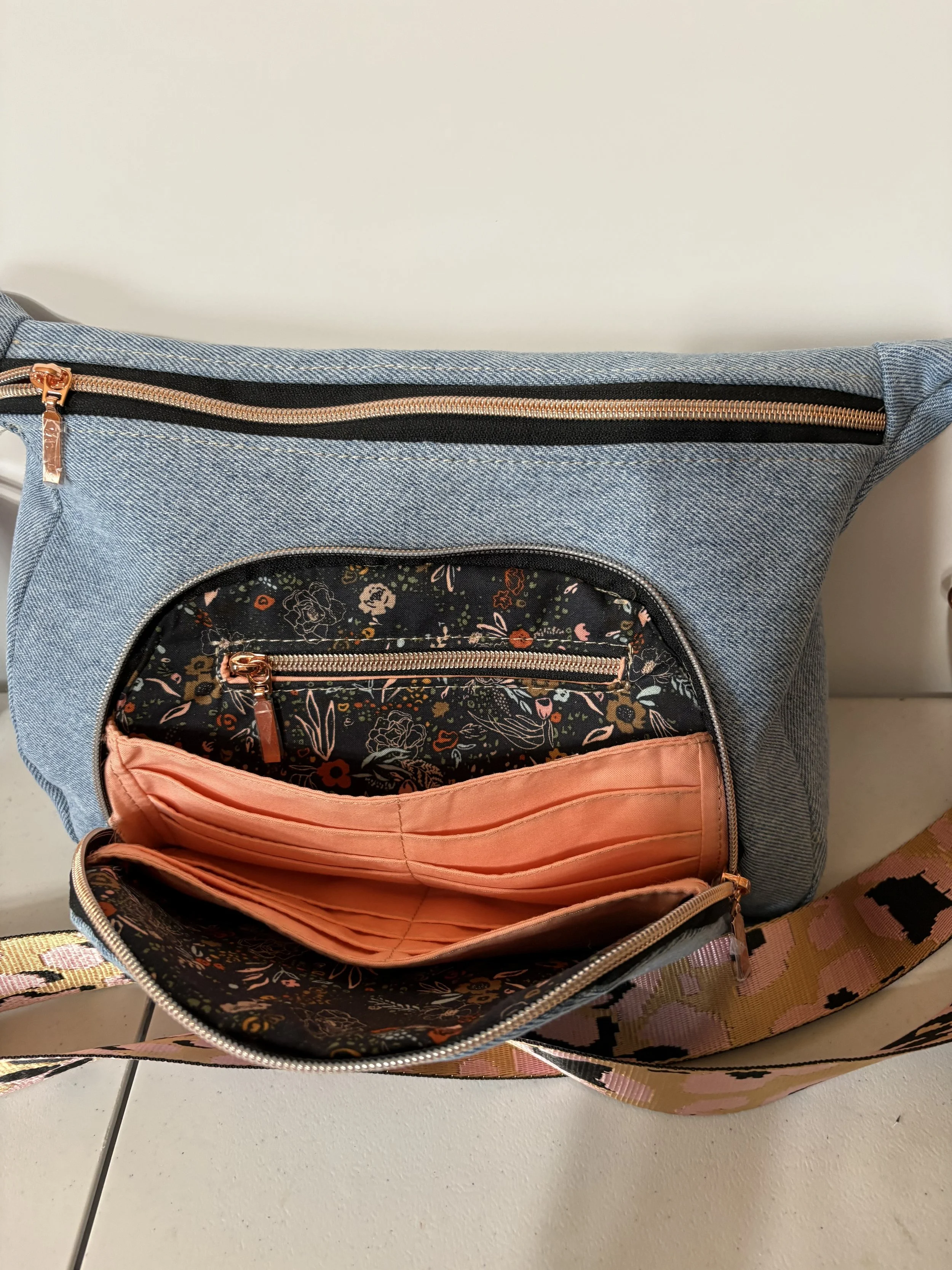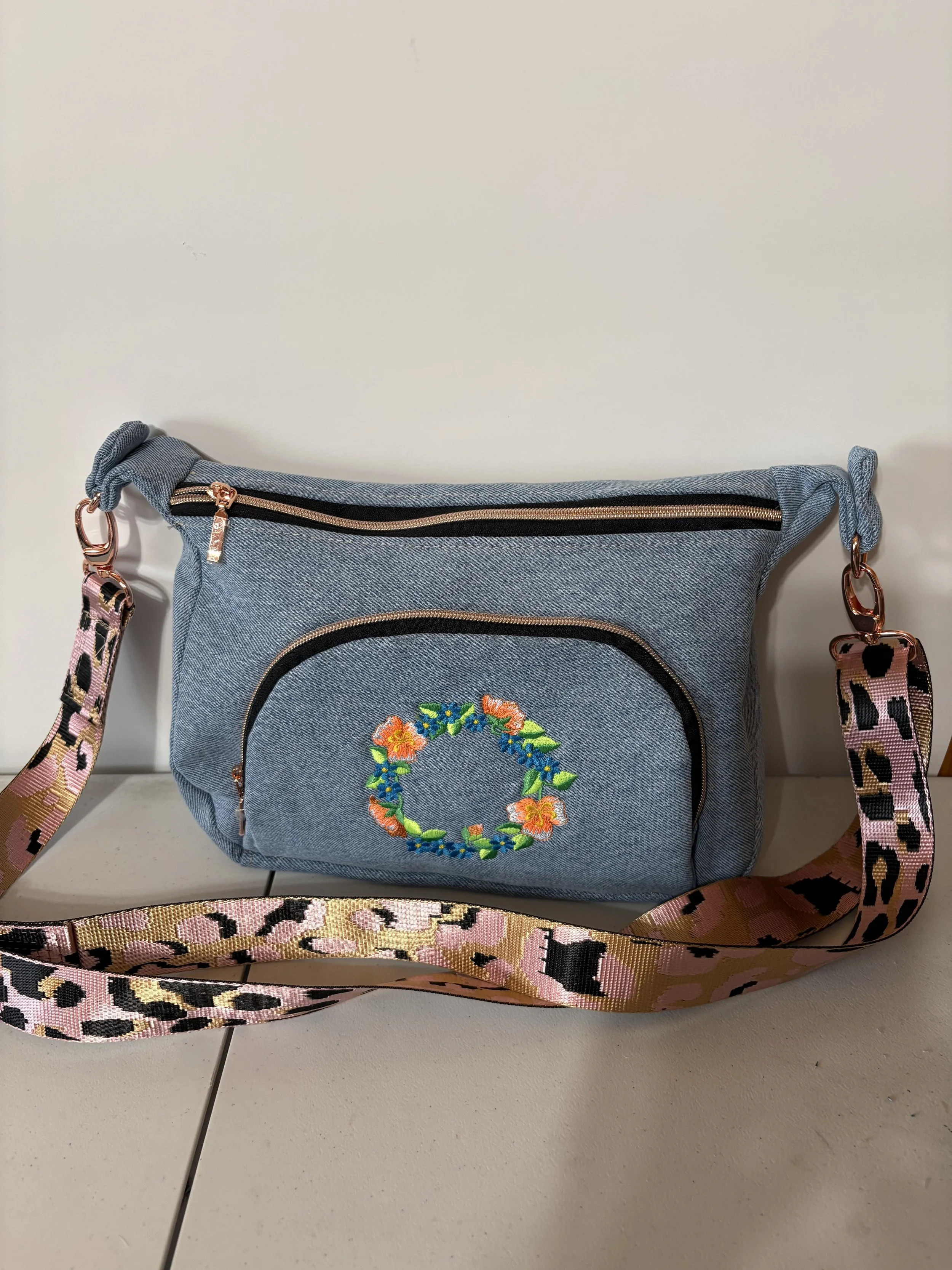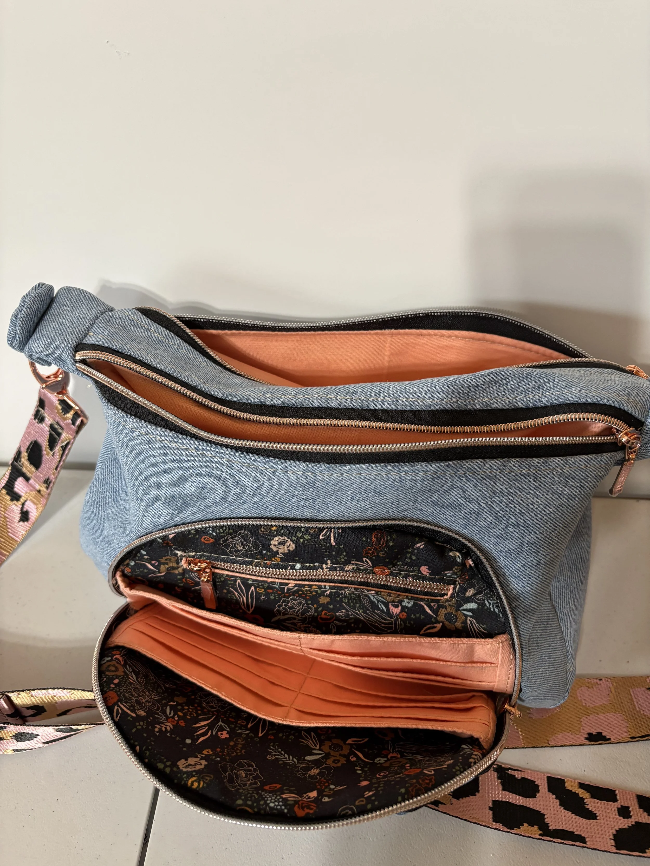 Denim Bag with Front zip pocket and two large sections. Leopard strap. Called “The Prairie Girl” by Janelle McKay of Emmaline Bags and Patterns.