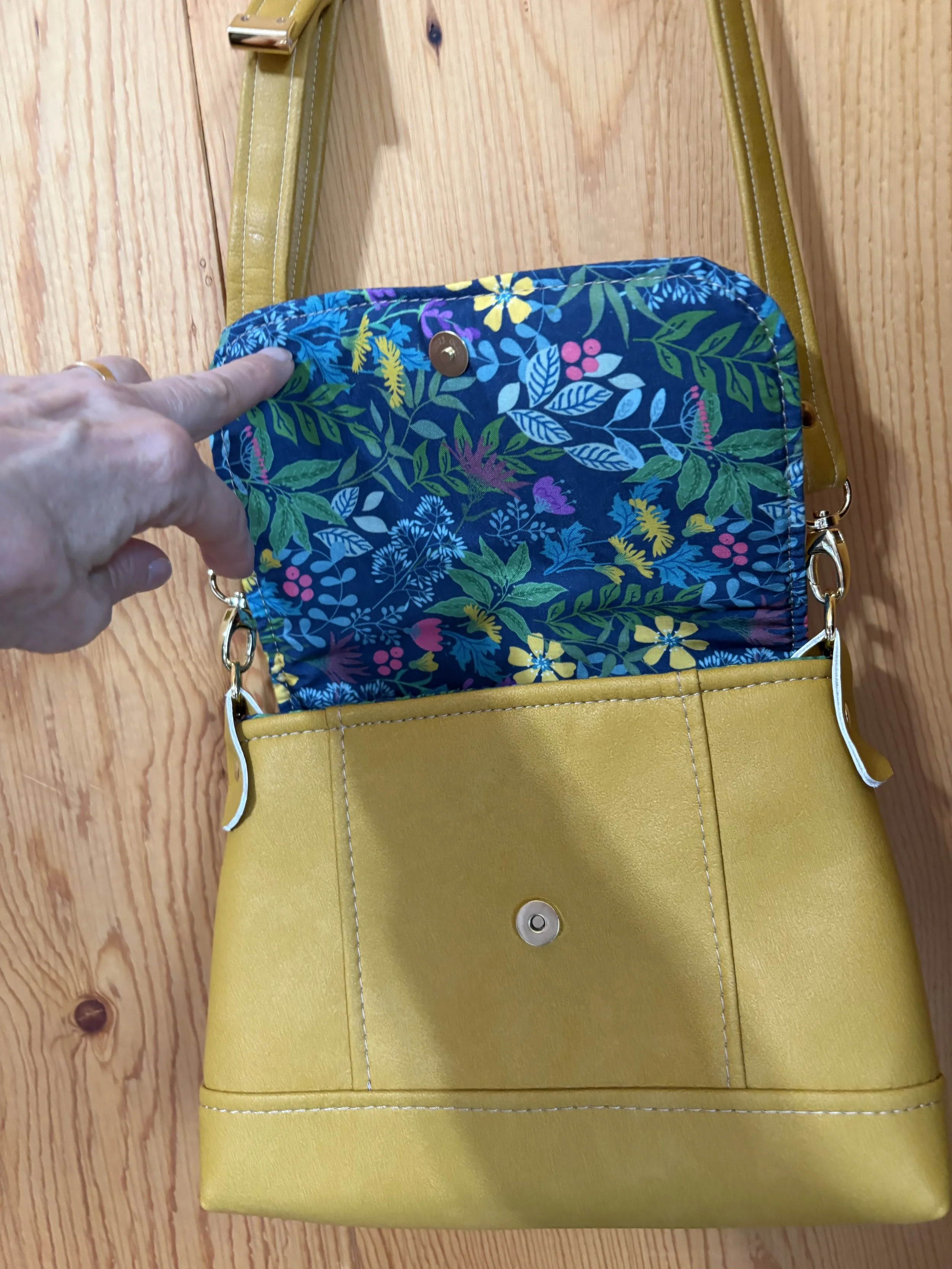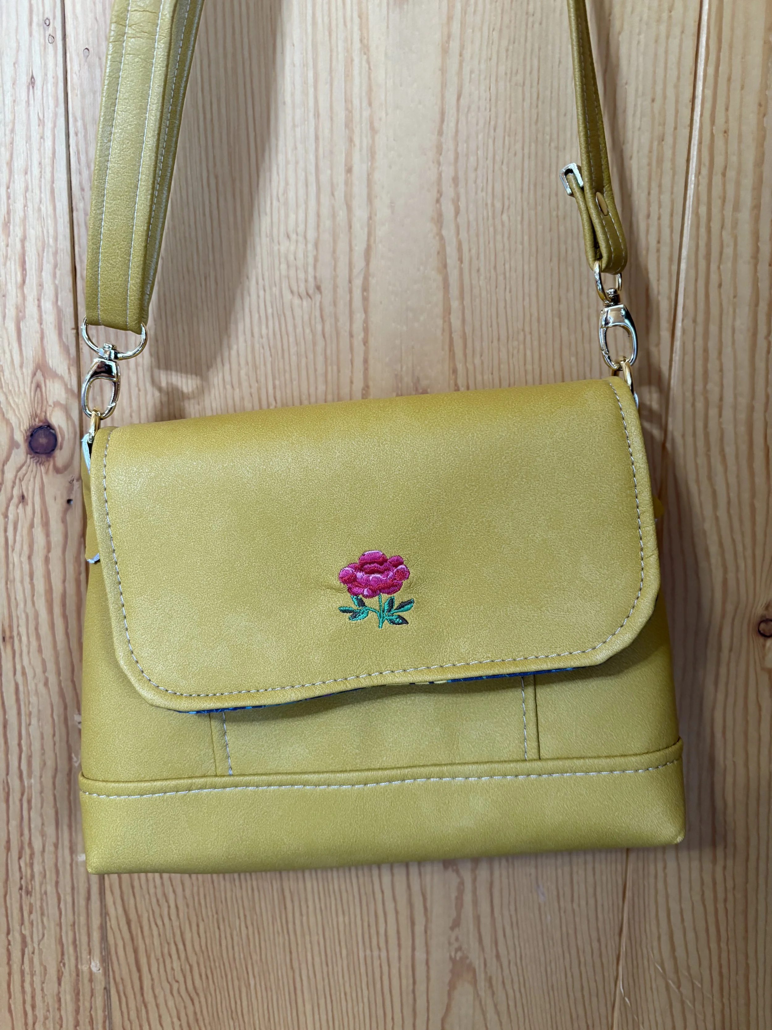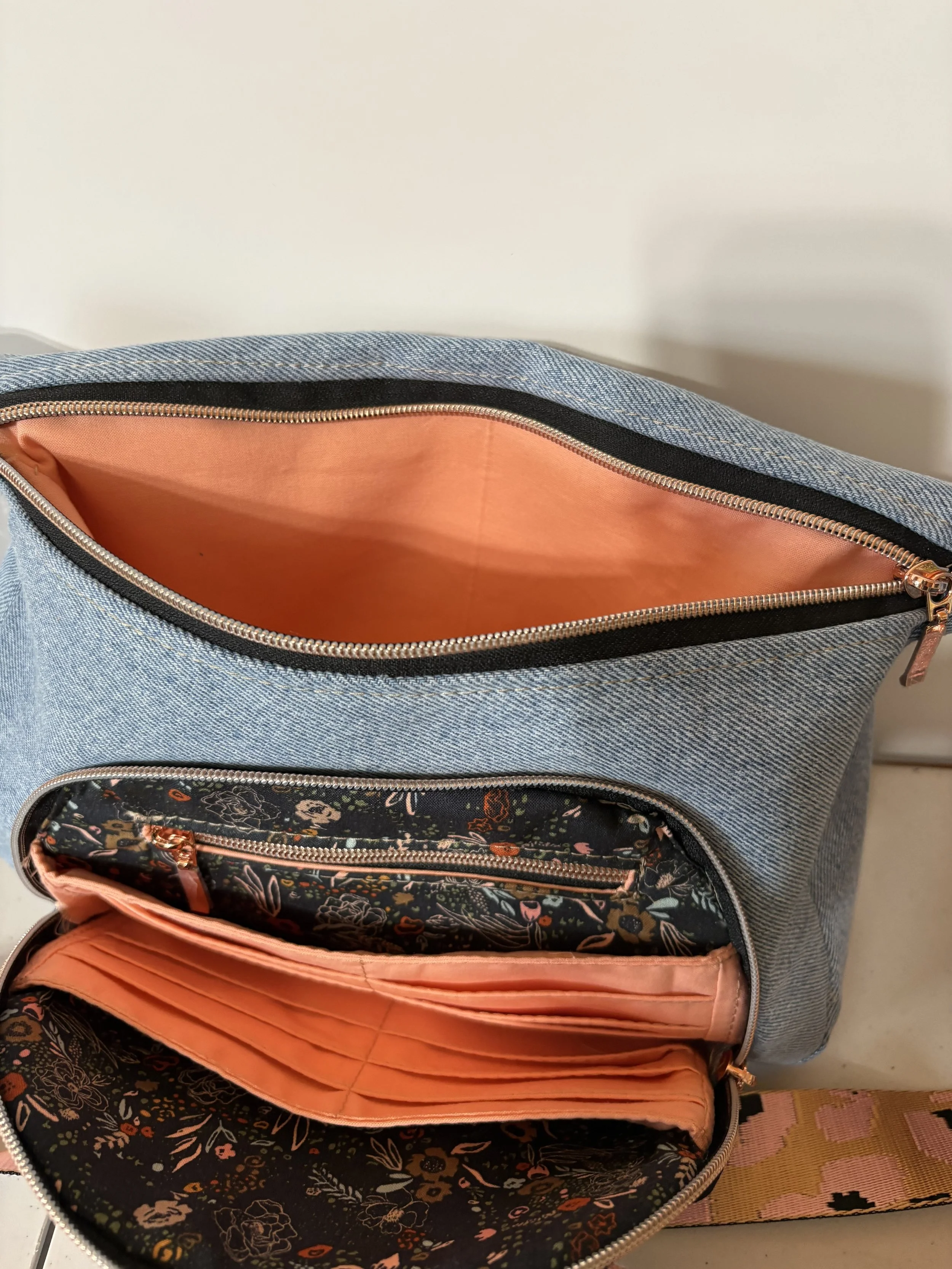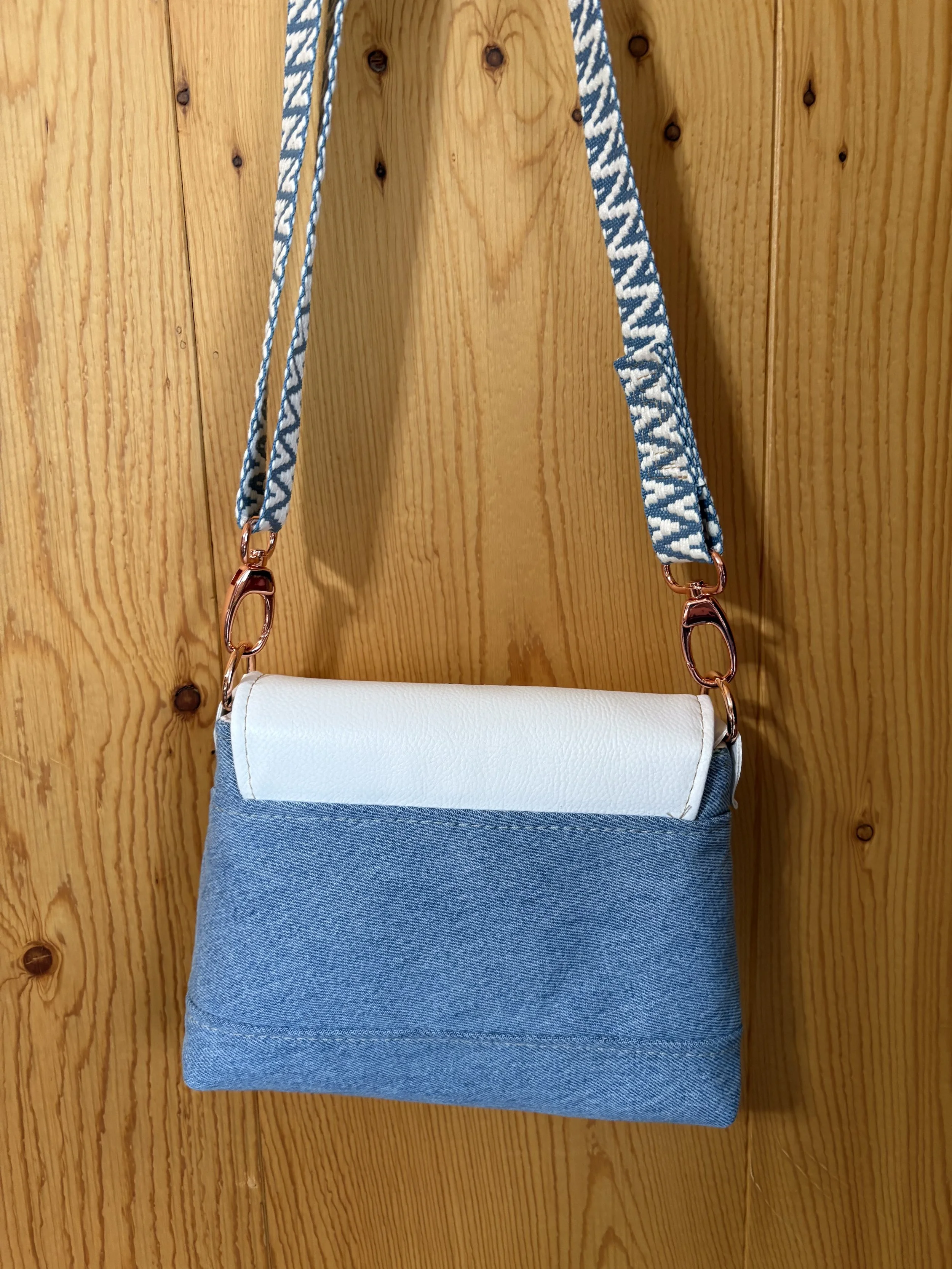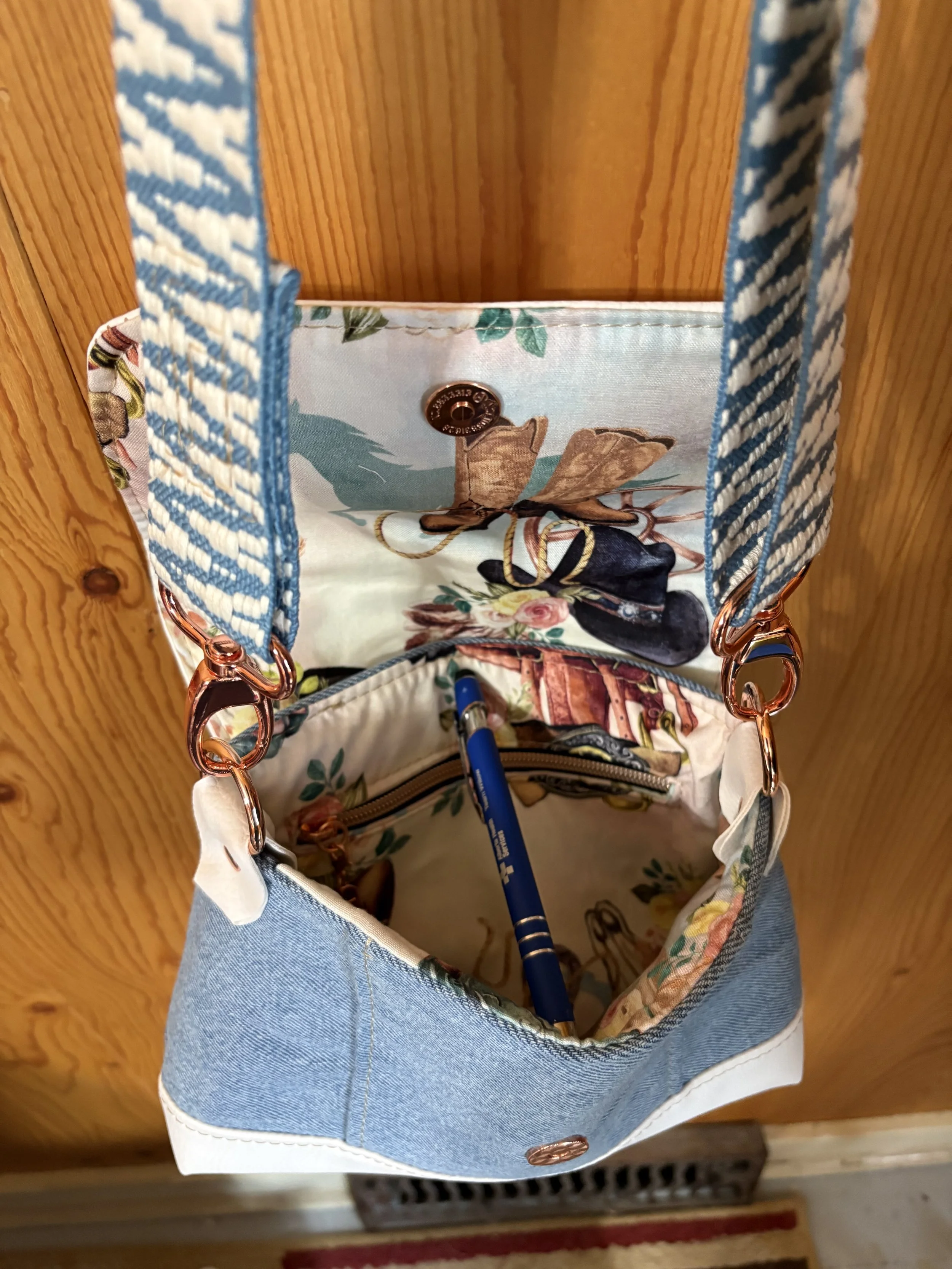 Denim Bag with Front zip pocket and two large sections. Leopard strap. Called “The Prairie Girl” by Janelle McKay of Emmaline Bags and Patterns.